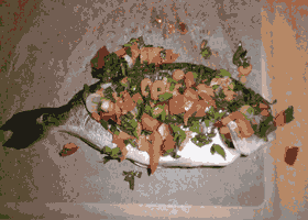 - Κομματιάζετε τη δάφνη και μαζί με λίγο μείγμα λαχανικών τα βάζετε στην κοιλιά των ψαριών.